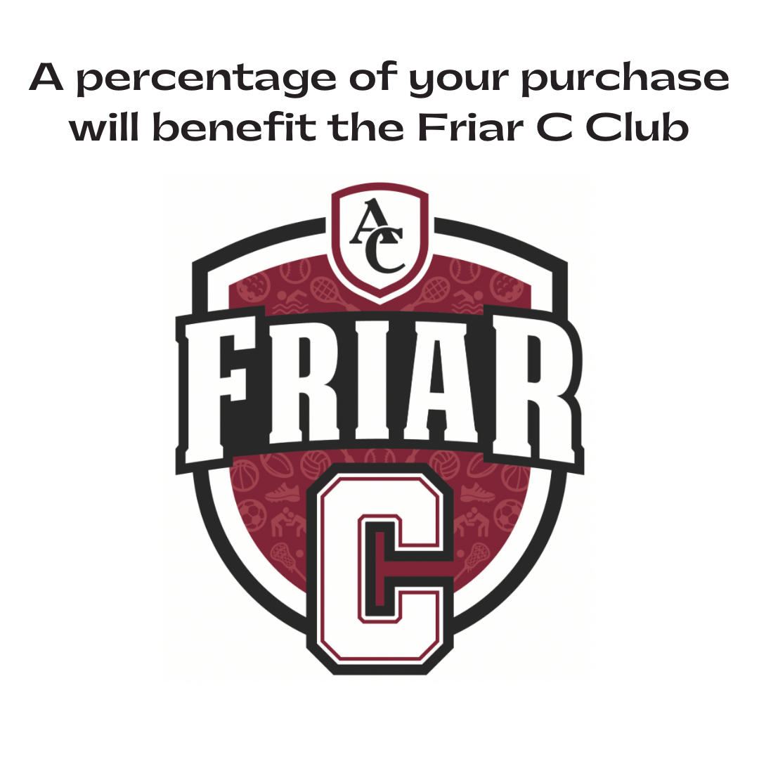 Archbishop Curley Friar C logo with text stating a percentage of your purchase will benefit the Friar C Club
