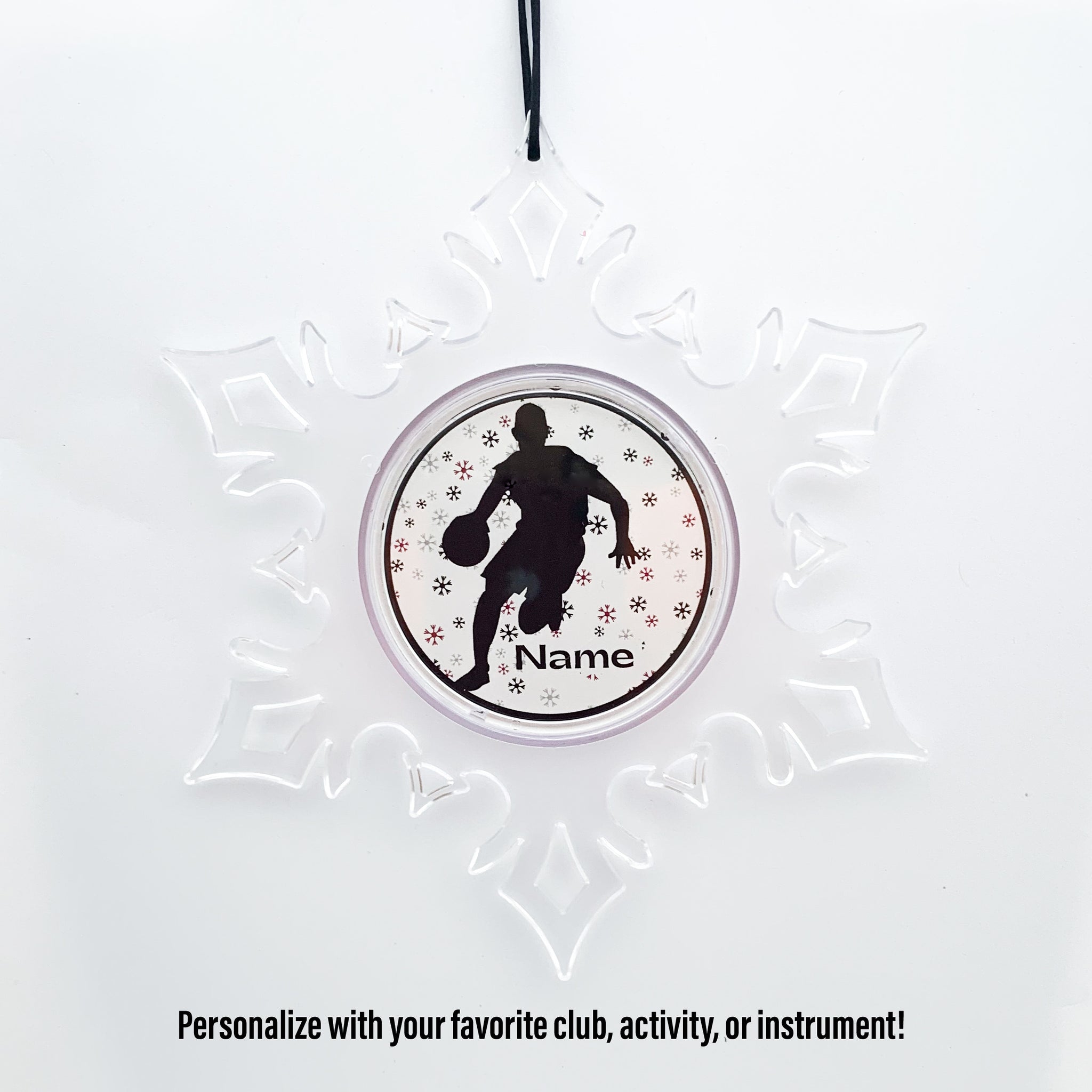 personalized acrylic snowflake ornament with male basketball silhouette, text name, and snowflakes background
