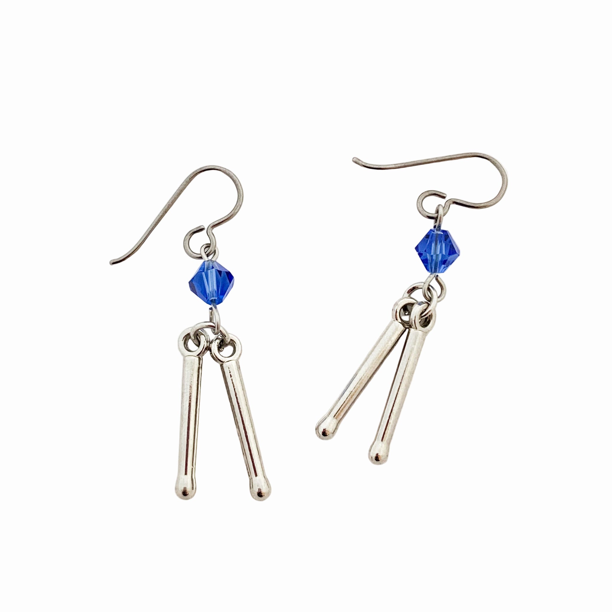 silver drumsticks charm earrings with blue sapphire Swarovski crystal beads
