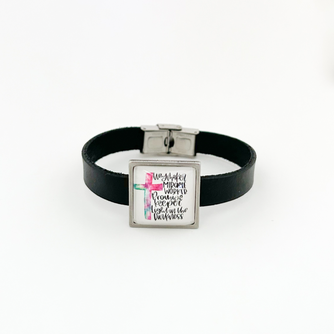 black leather bracelet featuring christian graphic slide charm and stainless steel clasp