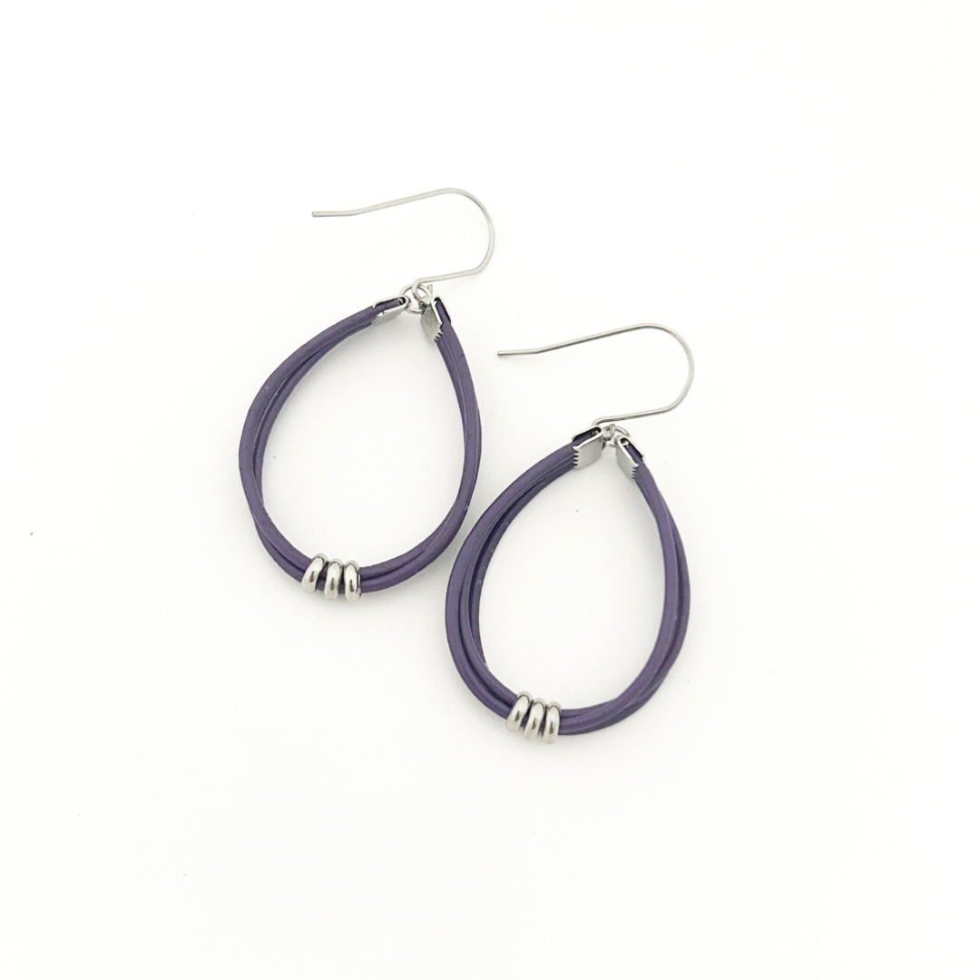 purple leather cord hoop earrings with stainless steel accents and titanium ear wires