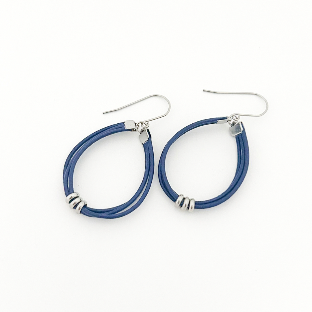 navy blue leather cord hoop earrings with stainless steel accents and titanium ear wires
