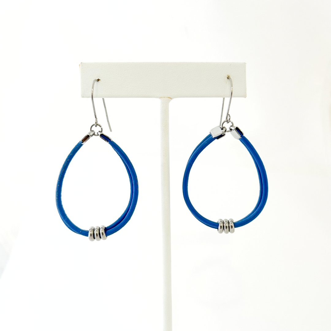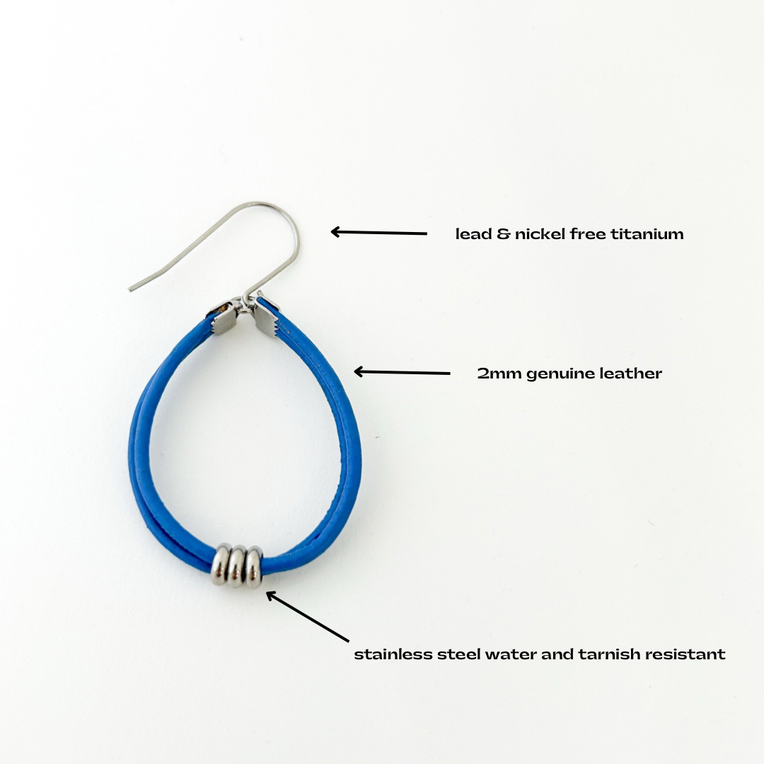 blue leather cord hoop earrings with stainless steel accents and titanium ear wires