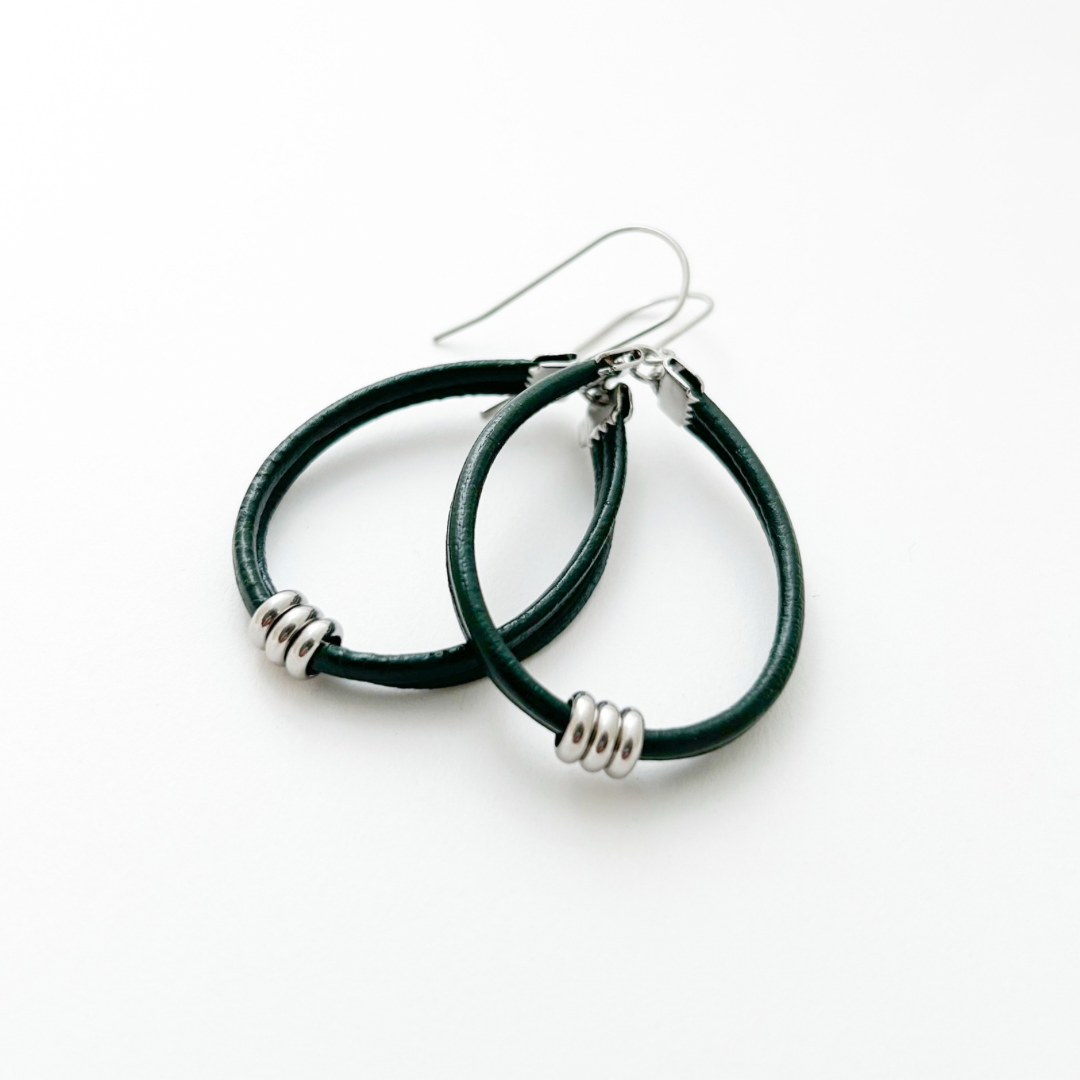 dark hunter green leather hoop earrings with stainless steel accents and titanium ear wires