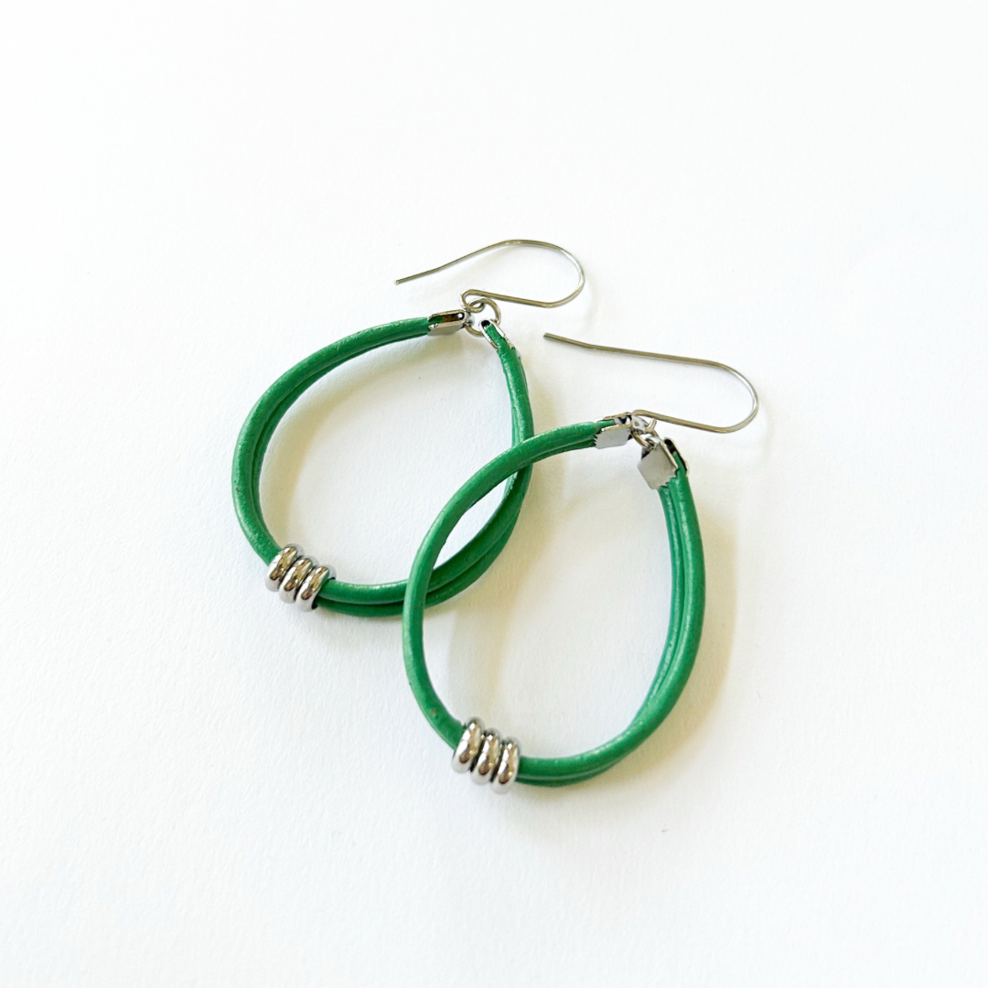 green leather cord hoop earrings with stainless steel accents and titanium ear wires
