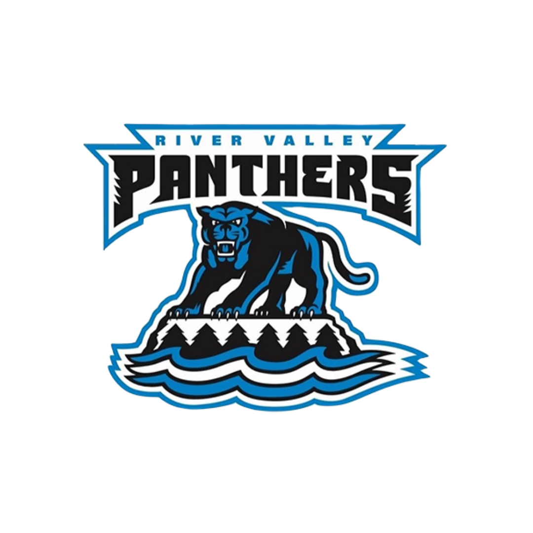 Set of six graphic options featuring River valley panther and RV logos with different color schemes in black, blue, and white